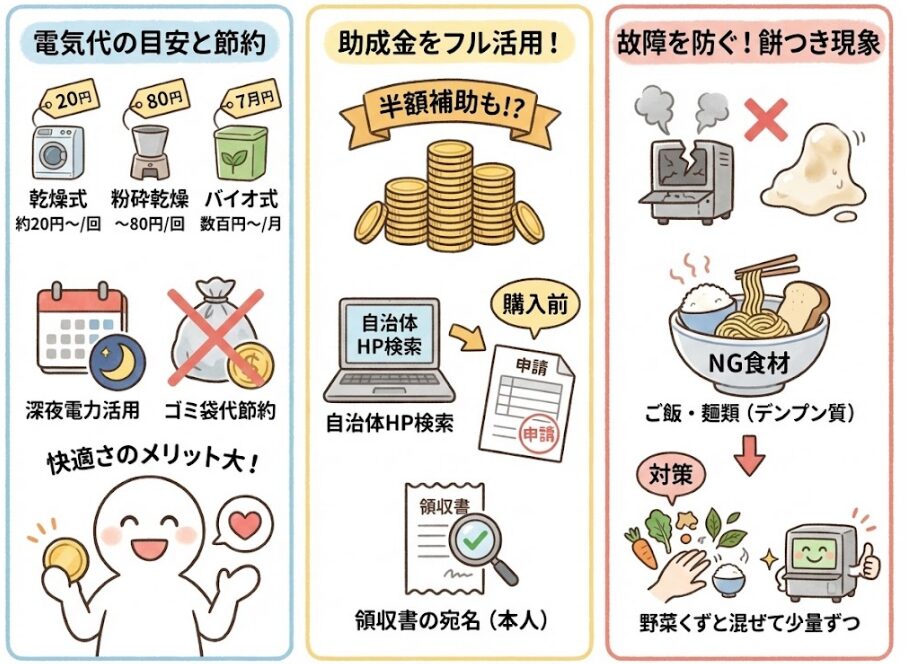 一方、粉砕乾燥式はモーターやヒーターを強力に使うため、処理量によっては1回80円ほどかかる場合もあります。しかし、生ゴミの量を減らしてゴミ出しの回数が減ることを考えれば、指定ゴミ袋代の節約にもなり、トータルでの負担増はそれほど大きくありません。