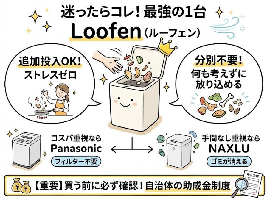 生ごみ処理機は、一度使うと「二度とこれまでの生活には戻れない」と言われるほど満足度の高い家電です。もし、この記事を読んでもまだ迷っているなら、第1位の「loofen(ルーフェン)」を強くおすすめします。